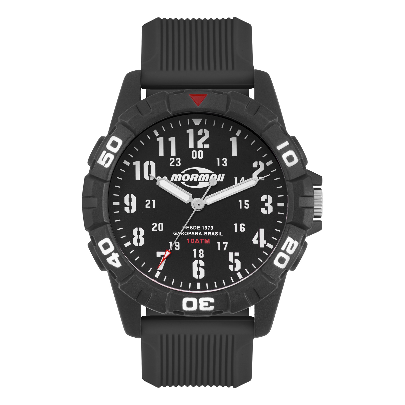 Relógio Mormaii Casual com design moderno e robusto, perfeito para o dia a dia e momentos de lazer. Possui caixa de 47 mm e mostrador analógico em preto com marcadores brancos e ponteiro de segundos vermelho, destacando-se pelo estilo esportivo e funcional.
